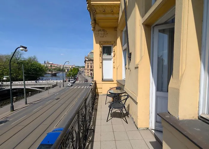 O apartamento Riverside Gem W Balcony View Praga de 90 m² está localizado a uma distância aproximada de 2 km de Catedral de São Vito e a 12 minutos a pé de Kostel Pražského Jezulátka.